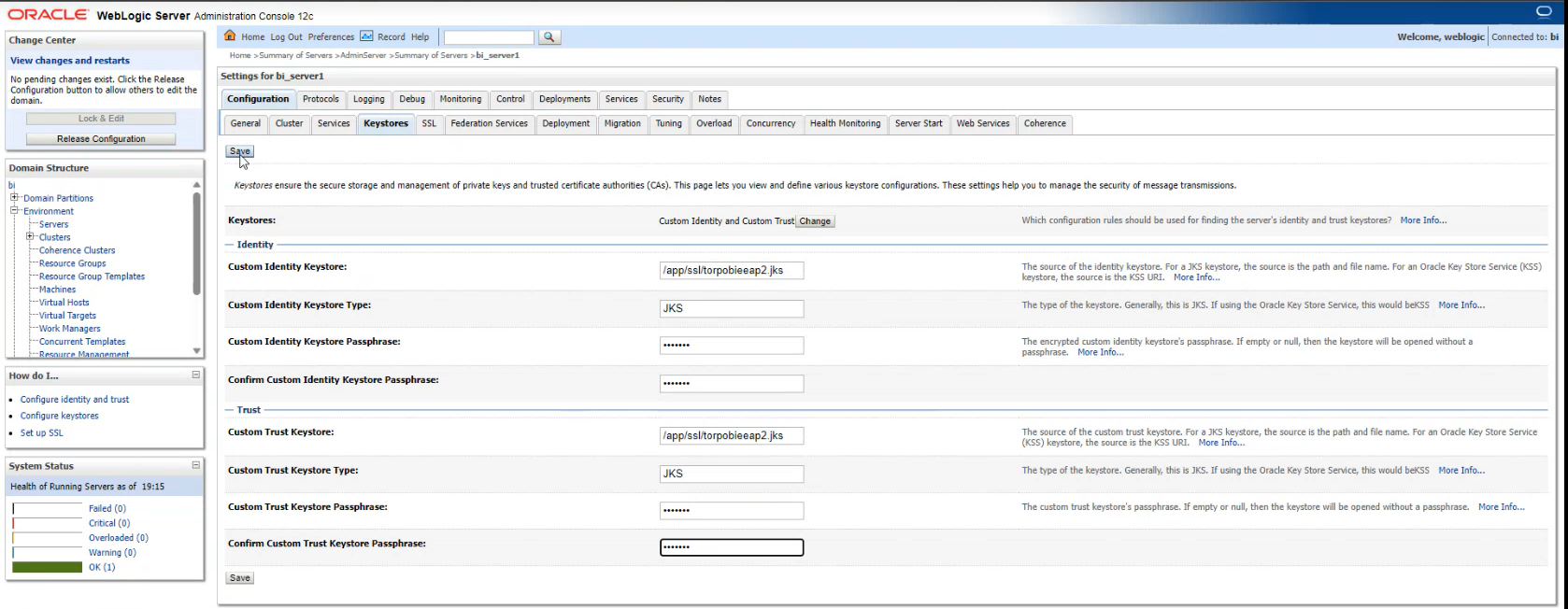 7-Upadte the Custom Identity & Trust Keystore Passphrase for Managed Server (bi_server1) :